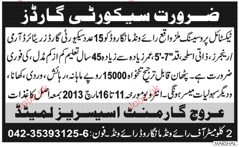 Security Guards are required in Urooj Garment Accessories Limited in Lahore