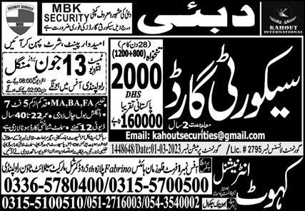 Latest Security jobs and others Overseas jobs in Kahout International Oversea Employment closing date is around June 13, 2023, see exact from ad. Read complete ad online to know how to apply on latest Kahout International Oversea Employment job opportunities. Some jobs in Kahout International Oversea Employment may require skills like Security and English (UK). Salary varies from 160000. Earn more by overtime. During job transport, medical and accommodation facility is available.