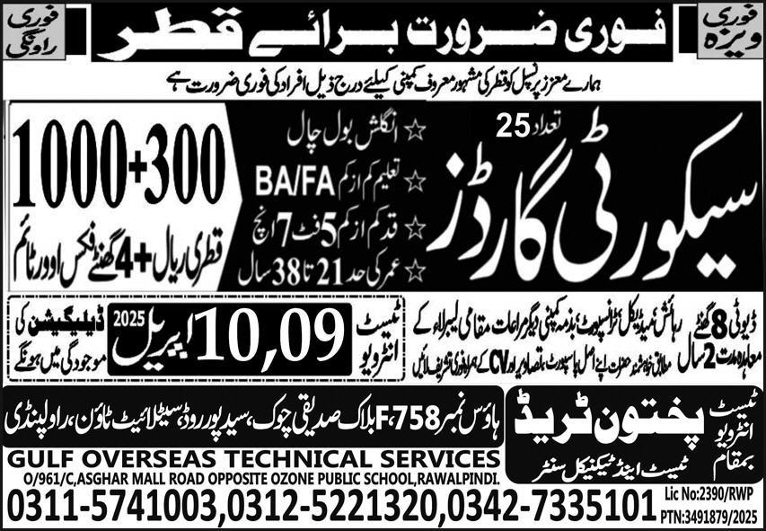 Pakhtoon Trade Test & Technical Center invites applications for job positions advertised in daily Express dated 9 April 2025 for following vacancies in Doha, doha Qatar.