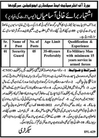 Latest Board of Intermediate and Secondary Education BISE Security Posts Sargodha 2025