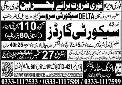 Rising Star International Trade Test & Technical Training Center Bahrain, bahrain Bahrain invites applications from eligible candidates for the post of security guard as per advertisement of September 26, 2024 published in daily Express Newspaper. Candidates with Matric and Intermediate etc. educational background will be preferred.