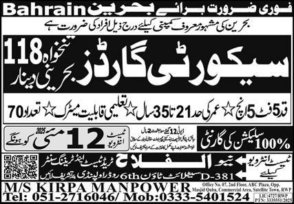 New Al Falah Trade Test & Training Center Bahrain, bahrain Bahrain invites applications from eligible candidates for the post of security guard as per advertisement of May 10, 2025 published in daily Express Newspaper. Preferred Education is Matric etc.