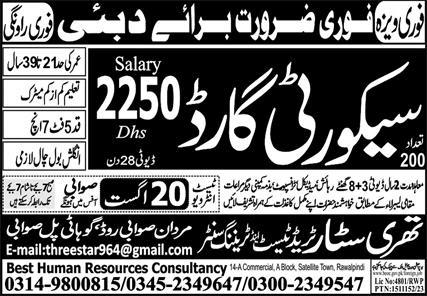 Vacant posts including security guard are announced in Three Star Trade Test & Training Centre Dubai, abu dhabi Dubai as per 12 August 2023 advertisement in daily Express Newspaper. Candidates with Matric etc. educational background will be preferred.