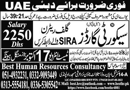 Best Human Resources Consultancy Dubai, abu dhabi Dubai invites applications from eligible candidates for the post of female security guard and security guard as per advertisement of October 17, 2023 published in daily Express Newspaper. Preferred Education is Intermediate and Matric etc.