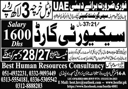 Best Human Resources Consultancy jobs advertisement dated about 26 December 2023 in daily Express Newspaper invites application for the vacant post of security guard in Abu Dhabi, dubai UAE. Candidates with Matric and Intermediate etc. educational background will be preferred.