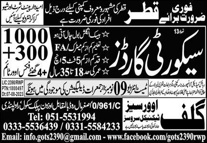 Gulf Overseas Technical Services jobs advertisement dated about 7 November 2023 in daily Express Newspaper invites application for the vacant post of security guard in Qatar, qatar Qatar. Matric and Intermediate etc. educational qualification will be preferred.