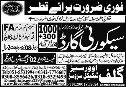 Gulf Overseas Technical Services jobs advertisement dated about 1 May 2024 in daily Express Newspaper invites application for the vacant post of security guard in Doha, doha Qatar. Preferred Education is Intermediate etc.