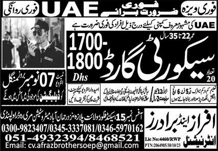 Afraz & Brothers International latest Overseas Security jobs and others can be applied till November 7, 2023 or as per closing date in newspaper ad. Read complete ad online to know how to apply on latest Afraz & Brothers International job opportunities. Some jobs in Afraz & Brothers International may require skills like English (US) and Security. Salary varies from 139000. Earn more by overtime. During job medical, accommodation and transport facility is available.