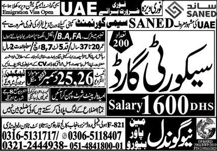 Vacant posts including security guard are announced in New Gondal Manpower Bureau Abu Dhabi, sharjah UAE as per 23 December 2023 advertisement in daily Express Newspaper. Persons with Bachelor, Intermediate and BA etc. education can apply.