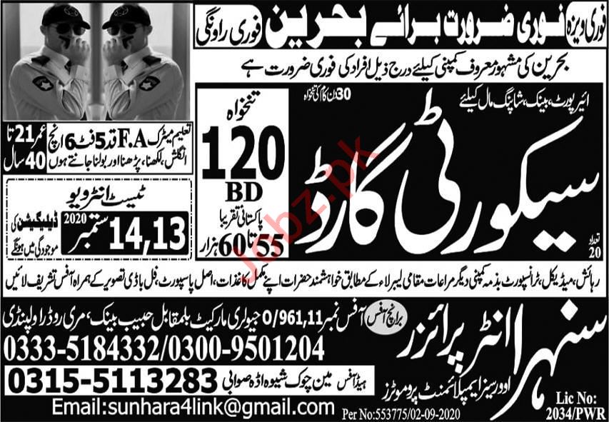 Latest Sunehra Enterprises Overseas Employment Security Posts Bahrain 2025