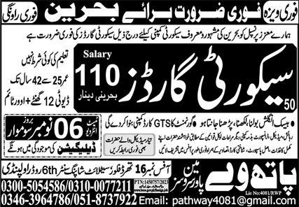 Pathway Manpower Services jobs advertisement dated about 4 November 2023 in daily Express Newspaper invites application for the vacant post of security guard in Bahrain, bahrain Bahrain. Matric etc. educational qualification will be preferred.