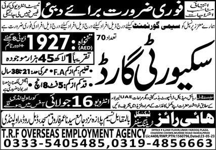 TRF Overseas Employment Agency Dubai, abu dhabi Dubai invites applications from eligible candidates for the post of security guard as per advertisement of July 15, 2023 published in daily Express Newspaper. Educational qualifications required Intermediate etc.