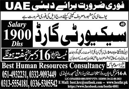 Best Human Resources Consultancy jobs advertisement dated about 15 December 2023 in daily Express Newspaper invites application for the vacant post of security guard in Dubai, sharjah Dubai. Persons with Intermediate and Matric etc. education can apply.