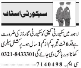 Security Company invites applications for job positions advertised in daily Jang dated 1 December 2023 for following vacancies in Lahore, lahore Punjab Pakistan.