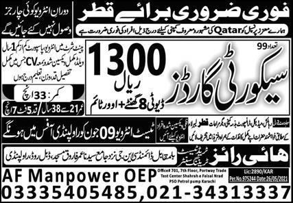 AF Manpower Overseas Employment Promoters jobs advertisement dated about 8 June 2022 in daily Express Newspaper invites application for the vacant post of security guard in Qatar, qatar Qatar. Educational qualifications required Matric and Intermediate etc.
