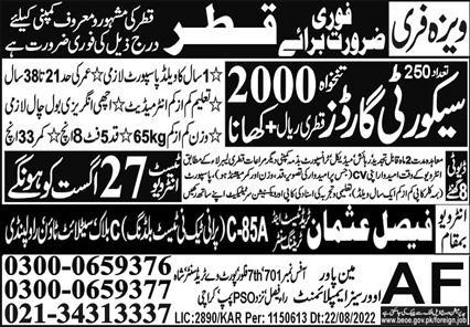 Faisal Usman Overseas Employment Promoters jobs advertisement dated about 27 August 2022 in daily Express Newspaper invites application for the vacant post of security guard in Qatar, qatar Qatar. Persons with Matric and Intermediate etc. education can apply.