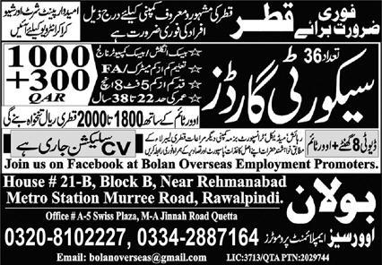 Bolan Overseas Employment Promoters Qatar, qatar Qatar invites applications from eligible candidates for the post of security guard as per advertisement of November 2, 2023 published in daily Express Newspaper. Preferred Education is Intermediate and Matric etc.