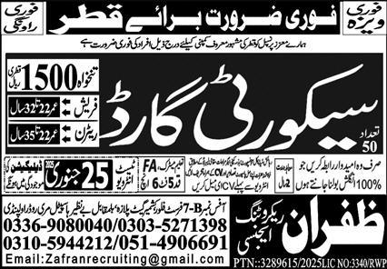 Zafran Recruiting Agency invites applications for job positions advertised in daily Express dated 23 January 2025 for following vacancies in Doha, doha Qatar.