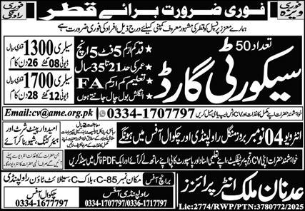 Adnan Malik Enterprises jobs advertisement dated about 31 October 2025 in daily Express Newspaper invites application for the vacant post of security guard in Doha, doha Qatar. Candidates with Intermediate etc. educational background will be preferred.