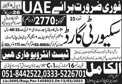 Vacant posts including security guard are announced in Al Kamil Enterprises Overseas Emplyment Promoters Abu Dhabi, sharjah UAE as per 21 March 2023 advertisement in daily Express Newspaper. Preferred Education is Matric and Intermediate etc.