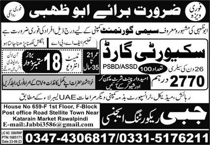 Jabbi Recruiting Agency invites applications for job positions advertised in daily Express dated 16 September 2023 for following vacancies in Abu Dhabi, sharjah UAE.