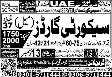 Green Line Human Trade Test & Technical Training Center jobs advertisement dated about 11 December 2025 in daily Express Newspaper invites application for the vacant post of security guard in Abu Dhabi, sharjah UAE. Preferred Education is Intermediate and Matric etc.