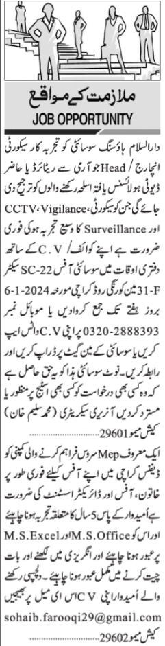 Private Company jobs advertisement dated about 2 January 2024 in daily Jang Newspaper invites application for the vacant post of security incharge, female director assistant, security head and female office assistant in Karachi, karachi Sindh Pakistan. Bachelor and Master etc. educational qualification will be preferred.