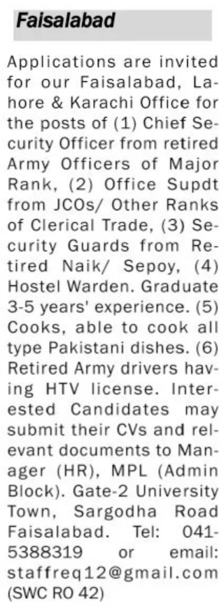 Vacant posts including cook, retired army driver, chief security officer, office superintendent, security guard and hostel warden are announced in Private Company Lahore, lahore, karachi and faisalabad Punjab Pakistan as per 22 September 2023 advertisement in daily The News Newspaper. Educational qualifications required Intermediate, Middle and Bachelor etc.