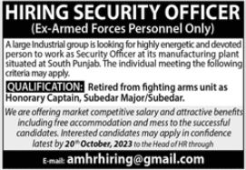 Industrial Group jobs advertisement dated about 8 October 2023 in daily Jang Newspaper invites application for the vacant post of security officer in Multan, multan Punjab Pakistan. Persons with Master and Bachelor etc. education can apply.