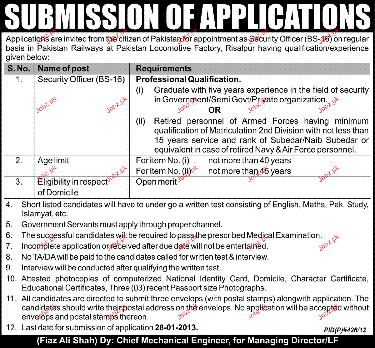 Apply as per details in job advertisement. Login to view further details of how to apply via https://www.jobz.pk online.