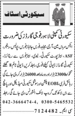 Vacant posts including security officer, security supervisor and security guard are announced in Security Company Lahore, lahore Punjab Pakistan as per 21 October 2022 advertisement in daily Jang Newspaper. Educational qualifications required Matric, Middle and Intermediate etc.