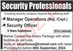 Security Company is looking for candidates for following posts as per job advertisement published in daily Jang Newspaper of September 1, 2024 for location Lahore, lahore Punjab Pakistan: