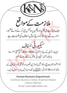 K & N Poultry Farm Lahore, lahore Punjab Pakistan invites applications from eligible candidates for the post of security staff as per advertisement of July 1, 2024 published in daily Jang Newspaper. Preferred Education is Matric and Middle etc.