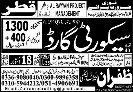 Latest Overseas jobs in Zafran Recruitments Agency in Security and others can be applied till 18 October 2022 or as per closing date in newspaper ad. Read complete ad online to know how to apply on latest Zafran Recruitments Agency job opportunities. Salary varies from 102000. Earn more by overtime. Facilities like transport, accommodation and medical may be provided.