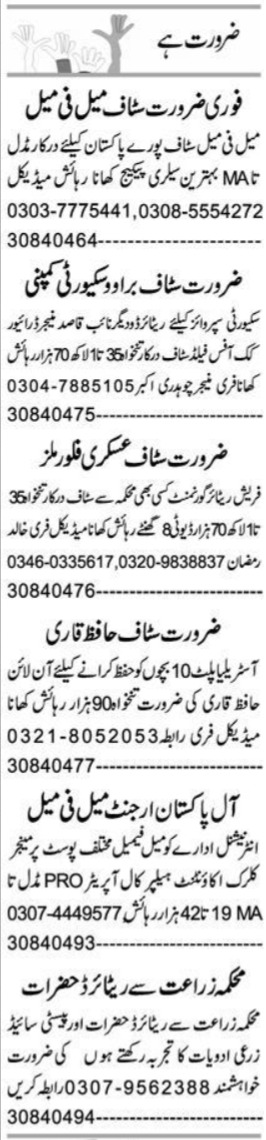 Vacant posts including naib qasid, clerk, retired agriculture staff, pro, accountant, management staff, driver, field staff, retired government staff, male female staff, manager, cook, qari, security supervisor, helper, call operator and office staff are announced in Private Peshawar, peshawar Khyber Pakhtunkhwa KPK Pakistan as per 12 January 2023 advertisement in daily Express Newspaper. Candidates with Master, Bachelor, Intermediate, Middle and Matric etc. educational background will be preferred.