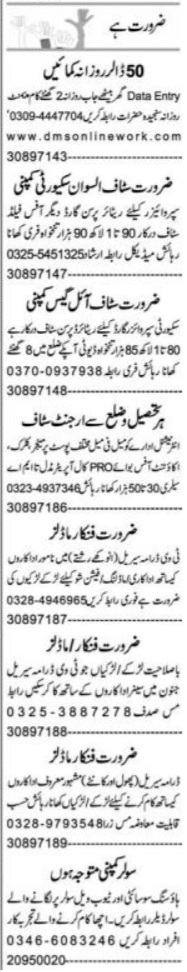 Private Company Lahore, lahore Punjab Pakistan invites applications from eligible candidates for the post of call operator, clerk, manager, field staff, solar dealer, data entry operator, security supervisor, accountant, office boy, model, pro, actor, security guard, retired person, office staff and supervisor as per advertisement of October 23, 2024 published in daily Express Newspaper. Middle, Matric, Master, Intermediate and Bachelor etc. educational qualification will be preferred.
