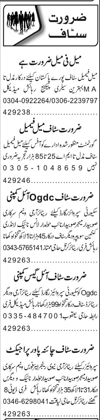 Private Sector jobs advertisement dated about 21 November 2022 in daily Roznama 92 News Newspaper invites application for the vacant post of retired subedar major, retired lance naik, retired naib havaldar, security supervisor, management staff, retired government staff, sweeper, retired subedar, male female staff, security guard and office staff in Lahore, lahore Punjab Pakistan. Candidates with Master, Intermediate, Matric, Bachelor and Middle etc. educational background will be preferred.