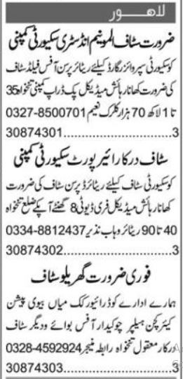 Private Company jobs advertisement dated about 15 March 2024 in daily Express Newspaper invites application for the vacant post of security guard, security supervisor guard, husband wife, security supervisor, office boy, field staff, driver, cook, patient care, chowkidar, office staff and kitchen helper in Lahore, lahore Punjab Pakistan. Candidates with Matric, Middle and Intermediate etc. educational background will be preferred.