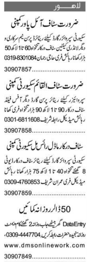 Private Company Lahore, lahore Punjab Pakistan invites applications from eligible candidates for the post of marketing staff, laundry canteen staff, field worker, supervisor, office staff, data entry operator and security supervisor guard as per advertisement of January 30, 2025 published in daily Express Newspaper. Educational qualifications required Middle, BA, Intermediate, Matric and Bachelor etc.