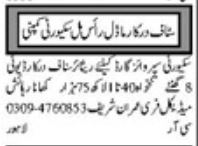 Vacant posts including security supervisor guard and security guard are announced in Security Company Lahore, lahore Punjab Pakistan as per 30 January 2025 advertisement in daily Khabrain Newspaper. Persons with Matric, Middle and Intermediate etc. education can apply.