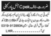CPEK Oil Company is looking for candidates for following posts as per job advertisement published in daily Khabrain Newspaper of May 30, 2025 for location Lahore, lahore Punjab Pakistan: