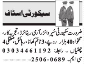 Security Company is looking for candidates for following posts as per job advertisement published in daily Jang Newspaper of June 27, 2025 for location Lahore, lahore Punjab Pakistan: