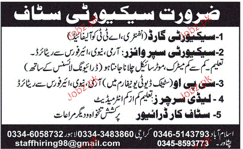 CPO, Lady Searchers, Staff Car Drivers, Security Supervisors and Security Guards are required in Karachi.