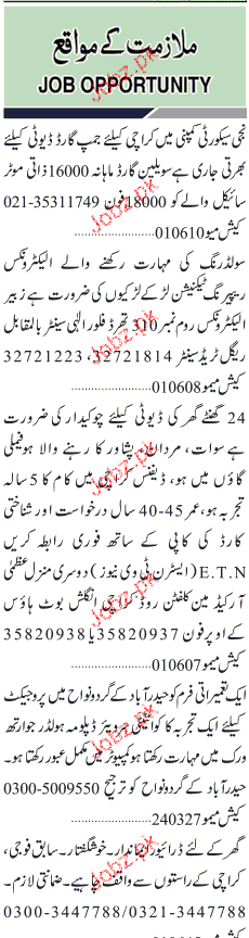 Telephone Operators, Electricians, Repairing Technicians, Civilian Guards, Chawkidars, Diploma Holders, Drivers, Security Supervisors and Security Guards are required in Karachi.