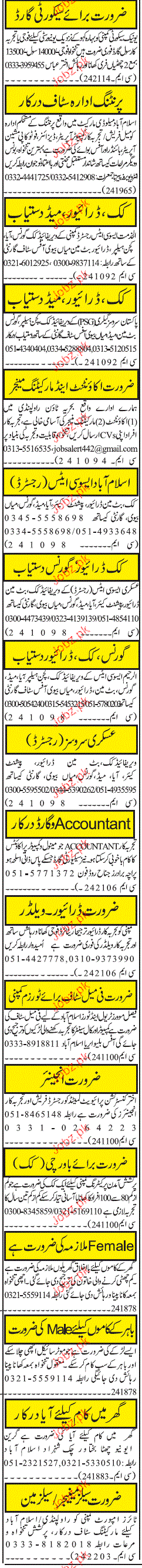 Computer Operators, Designers, Photocopy Operators, Binders, Security Supervisors, Cook, Drivers, Marketing Manager, Accountant and Security Guards are required in Rawalpindi.