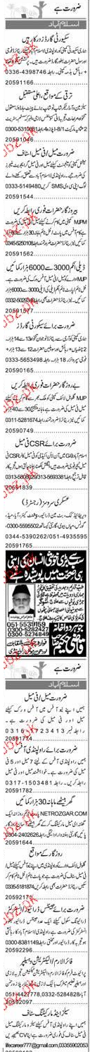 Call Center Representatives, Clerks, Data Entry Operators, Drivers, Eectricians, Helpers, Security Supervisors and Security Guards are required in Islamabad.