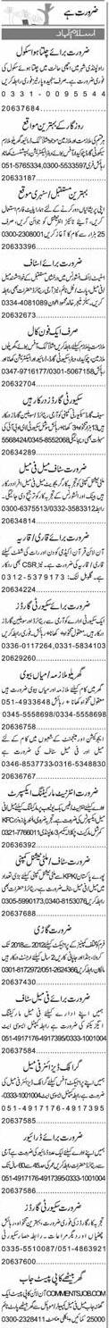 Marketing Staff, Drivers, Graphic Designers, Helpers, Data Entry Operators, Assistants, Security Supervisors and Security Guards are required in Islamabad.