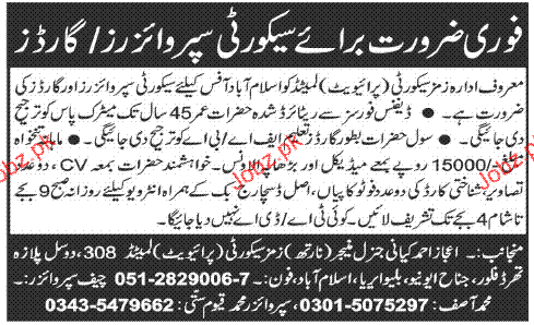 Security Supervisors and Security Guards are required Zims Security Ltd Islamabad