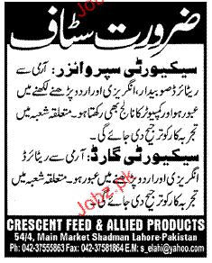 Security Supervisors and Security Guards are required in Crescent Feed & Allied Products in Lahore