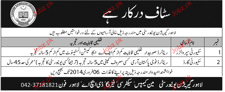 Security Supervisors and Security Guards are required in Lahore Garrison University in Lahore